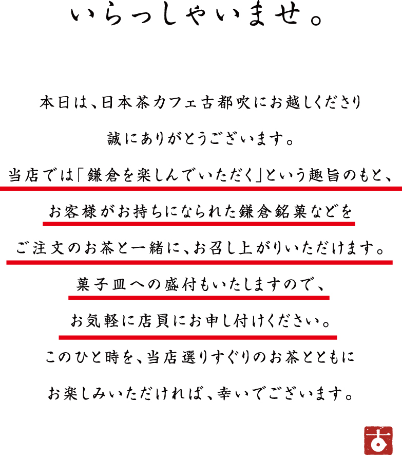 さらに、古都吹さんのメニューで注目していただきたいのが、挨拶ページの下記赤線部分↓